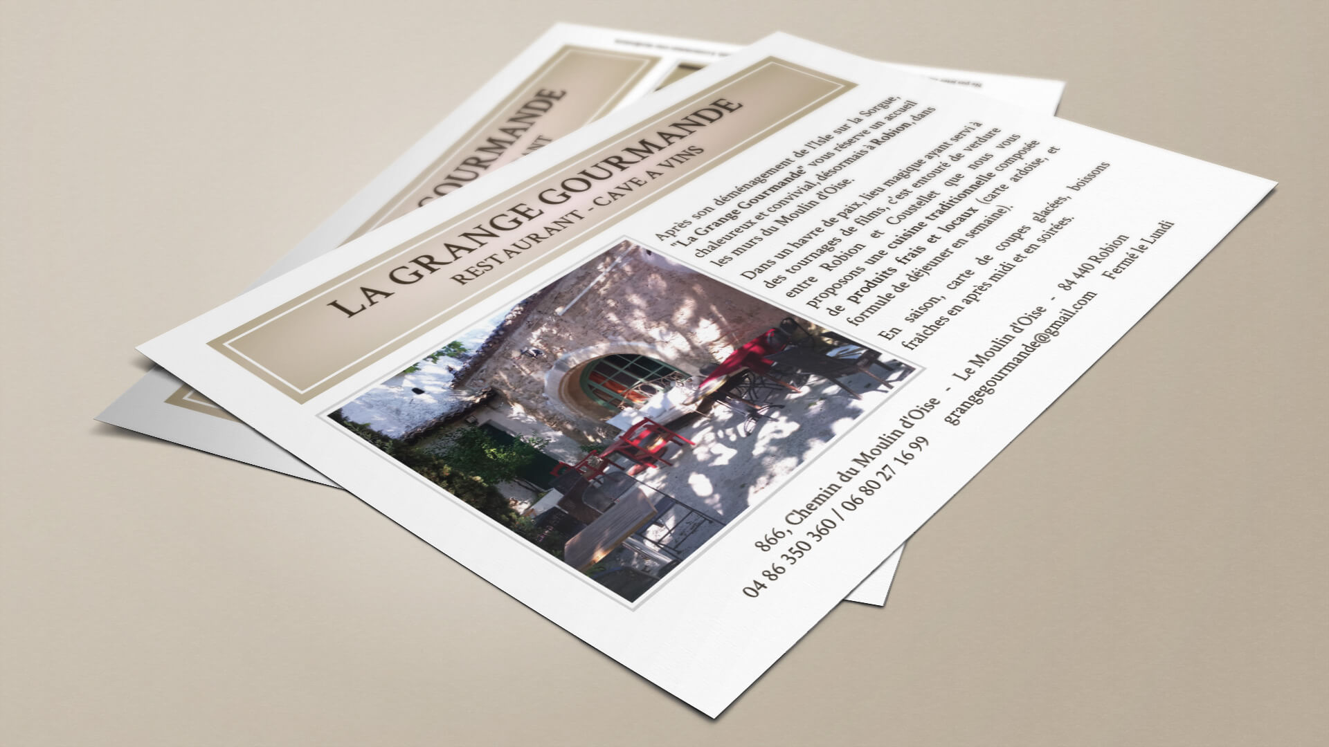 Suite à son déménagement de l’Isle sur la Sorgue, La Grange Gourmande a fait appel à Azuracom pour son nouveau flyer. Le restaurant vous accueille désormais à Robion, sur la route de Coustellet, dans les murs du Moulin d’Oise.